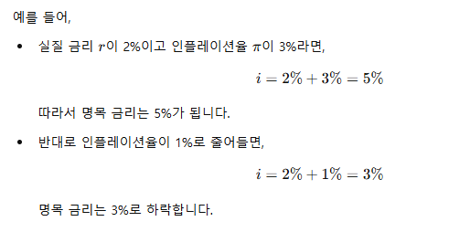 간단히 말해, 명목금리는 실질금리와 기대인플레이션의 합으로 나타낼 수 있습니다.