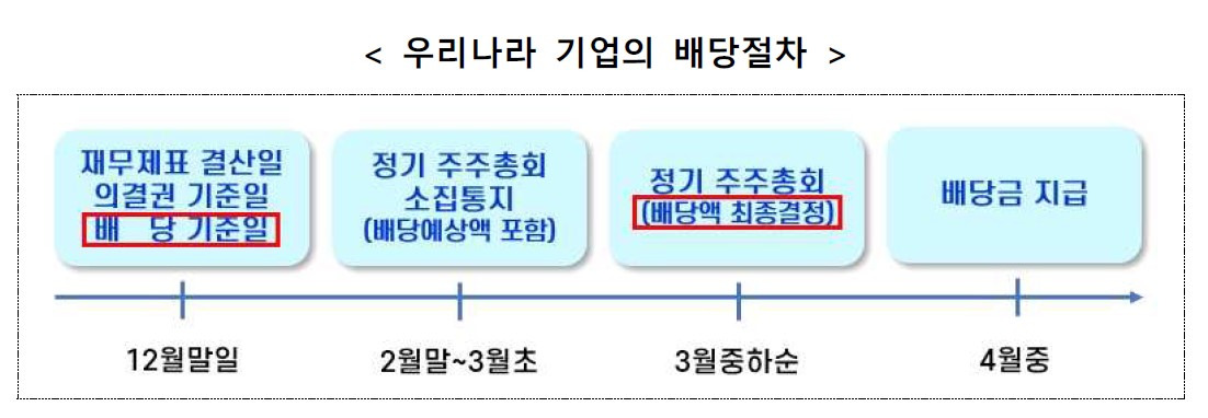 - 배당기준일 : 주주가 배당금을 받을 권리가 확정되는 날입니다.