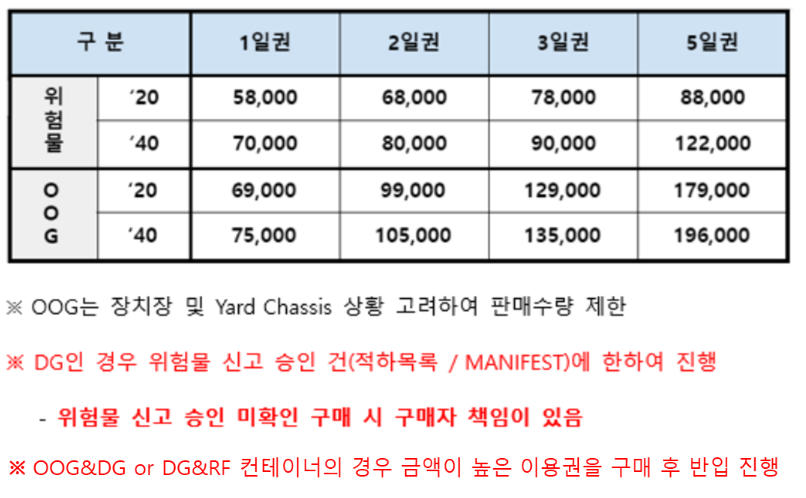 선반입권 : KRW 43,000 / CNTR (일반 20'FT, 40FT 동일)