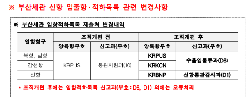 부산세관 신항 입출항 / 적하목록 관련 변경 사항