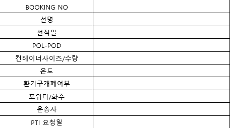 PTI 요청하는 양식은 선사마다 상이하지만 기본적으로 하기의 정보를 전달 해야합니다